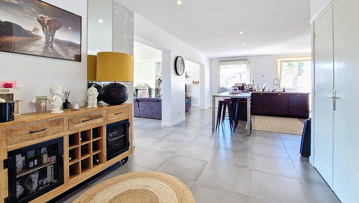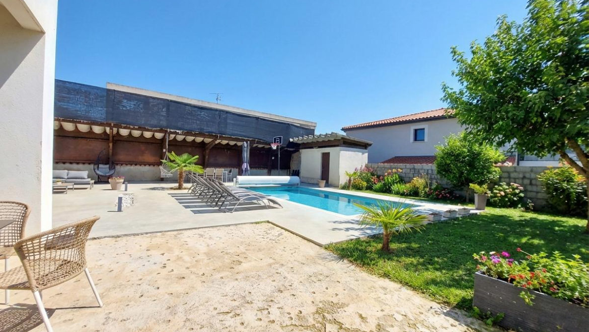 Elle dispose d’une superbe pièce de vie de 80m² avec cuisine équipée ouverte sur salon et salle à manger accès terrasse et piscine 8x4m avec volet motorisé. 5 belles chambres dont une suite parentale avec salle d’eau. Cellier. Chauffage gaz. Vous profiterez également d’une partie indépendante attenante de plus de 30m² pour réaliser un F2 ou un espace pour recevoir la famille ou pour de la profession libérale.