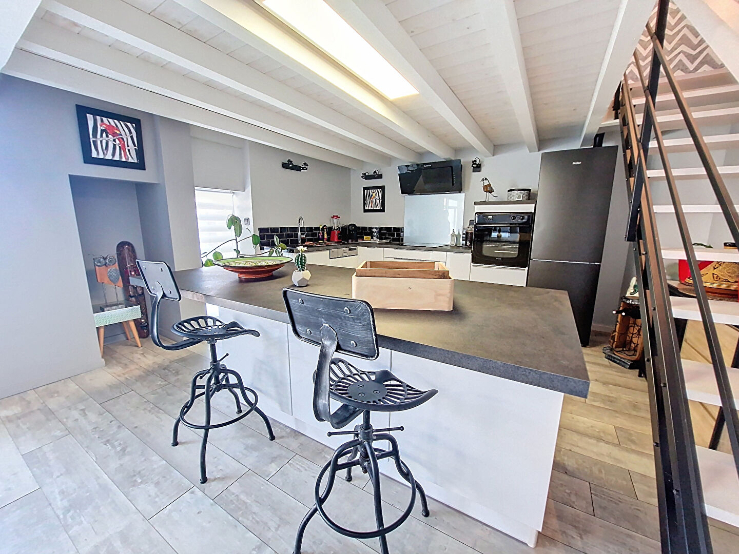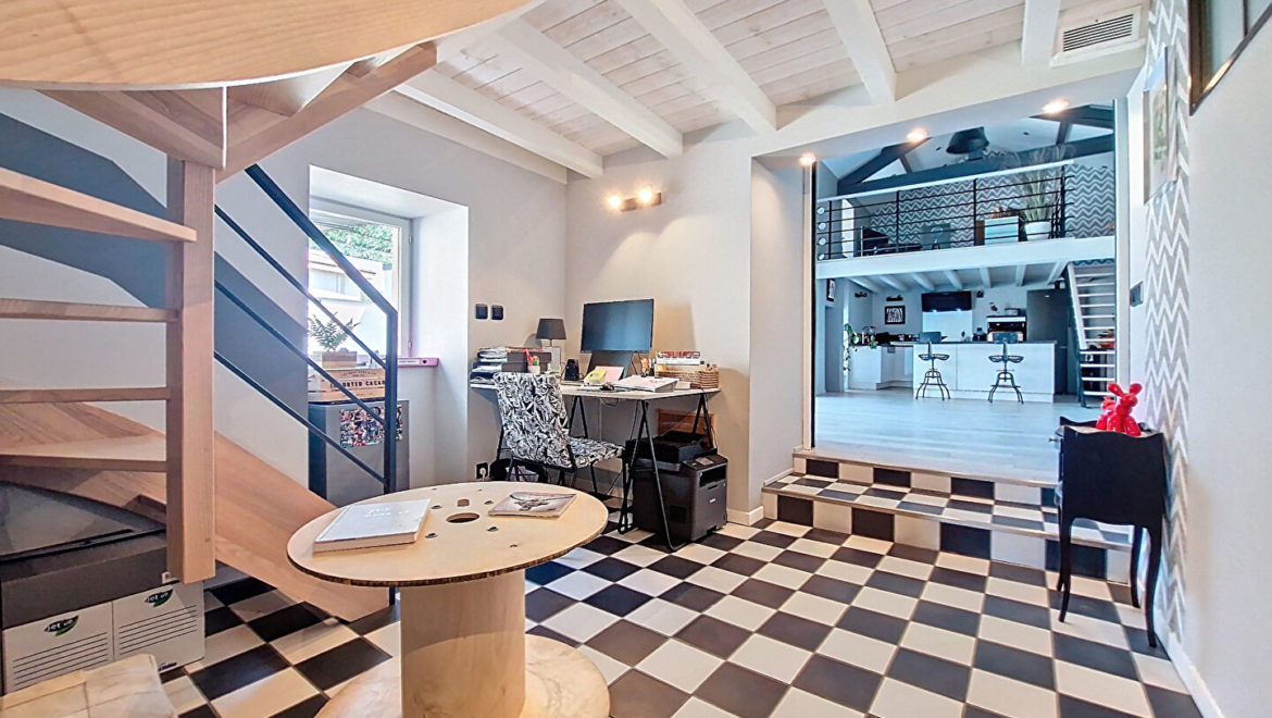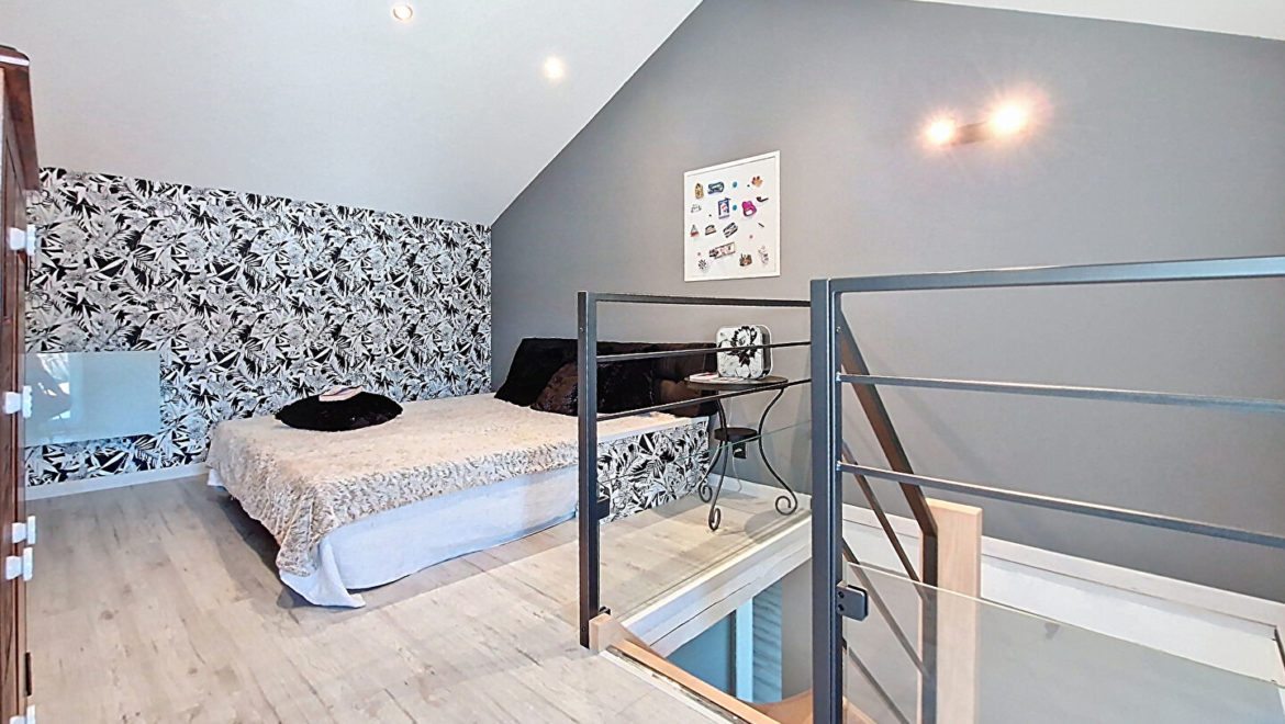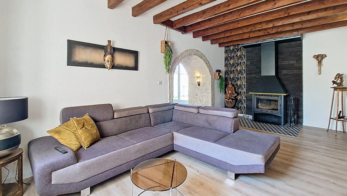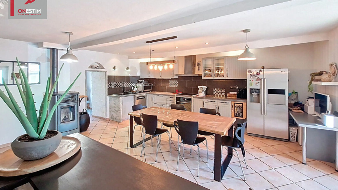 A l’intérieur, vous trouverez des pièces de vie totalisant près de 128m². Cuisine indépendante équipée 34m² avec poêle à granulés, un premier séjour de 21m² lumineux, salon/salle à manger 36m², seconde pièce de vie de 37m² (avec second poêle à granulés) avec cuisine équipée ouverte sur séjour avec belle hauteur sous plafond avec coin salon ou bureau en mezzanine de 16m². Salle de bains et d’une salle d’eau. Cellier/buanderie/wc.