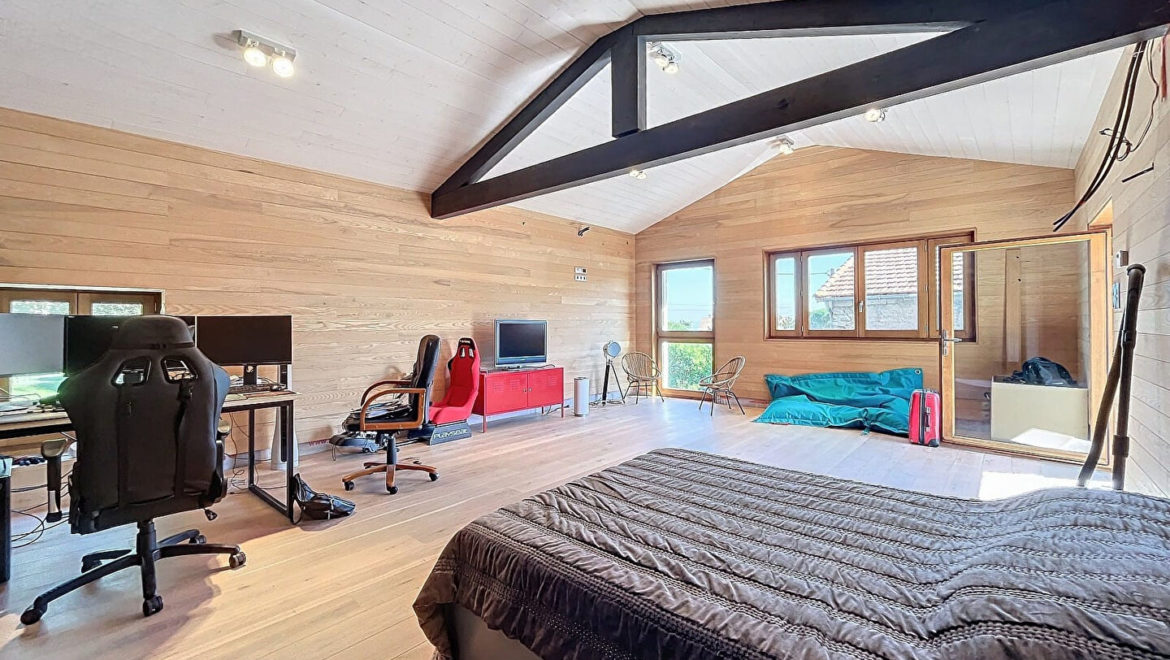 Au demi étage, une belle et grande suite parentale avec salle d’eau et dressing, un espace bureau.
